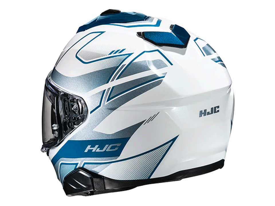Das HJ-38 Pinlock-Visier ist mit einem Druck-Schiebe-Verschlusssystem ausgestattet, das für hohe Sicherheit sorgt, dennoch auch mit Handschuhen leicht zu bedienen ist. Die Sonnenblende (HJ-V12) bietet dem Fahrer die Möglichkeit, die Sonnenblende in 3 Positionen nach vorne zu verstellen (bis zu 10 mm), um einen idealen Sonnenblendschutz zu gewährleisten. Der i71 ist auch mit den Smart HJC Bluetooth-Systemen der zweiten Generation kompatibel (Kommunikationssystem ist nicht im Lieferumfang enthalten).